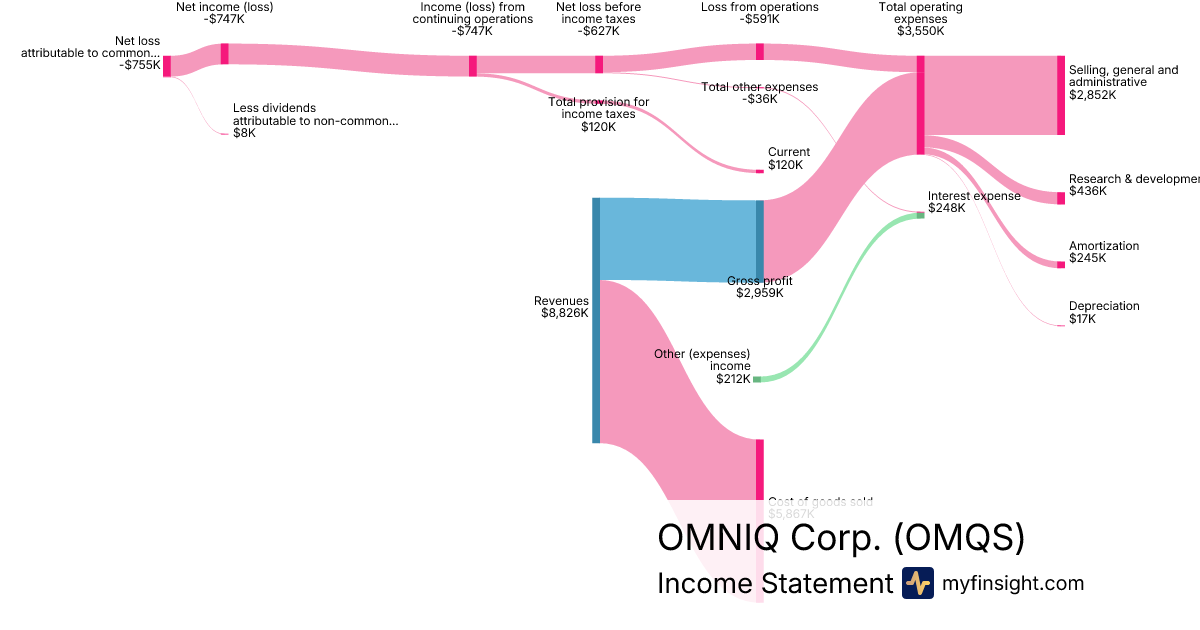 For the quarter ending 2025-09-30, OMQS made $8,826K in revenue. -$755K in net income. Net profit margin of -8.55%.