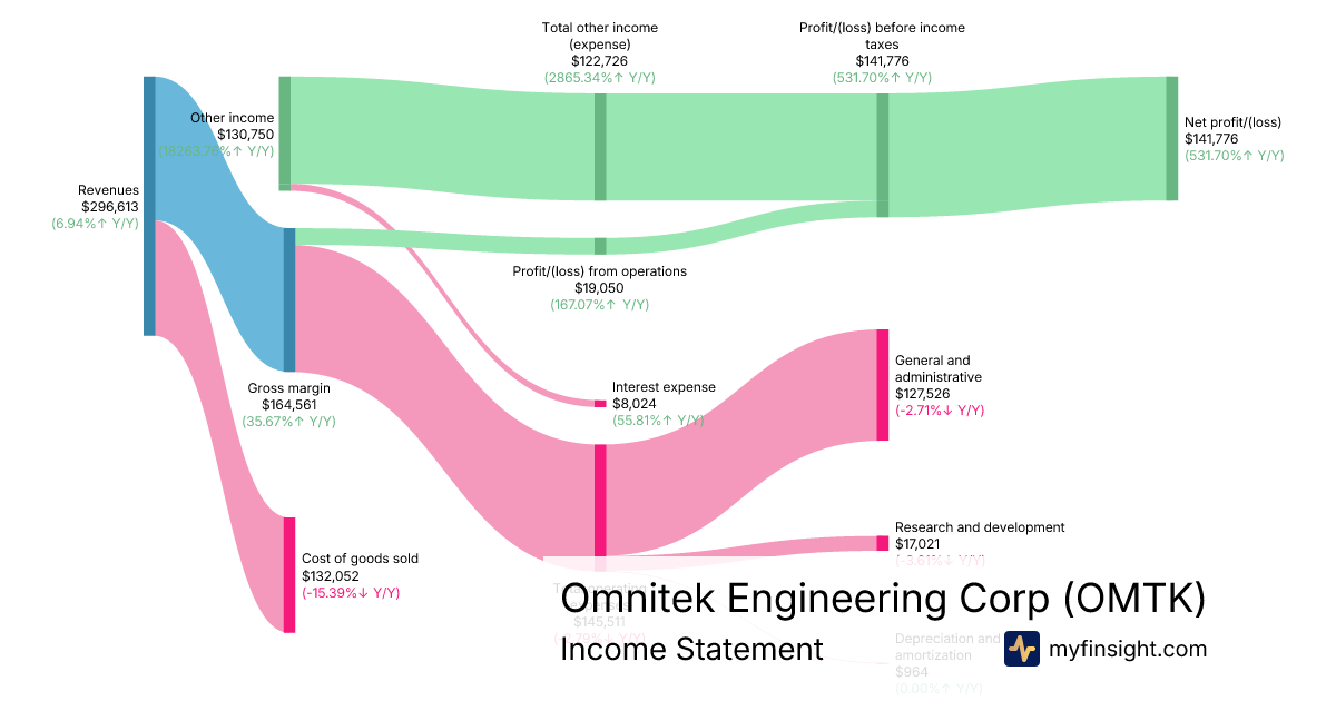 For the quarter ending 2025-09-30, OMTK made $296,613 in revenue. $141,776 in net income. Net profit margin of 47.80%.