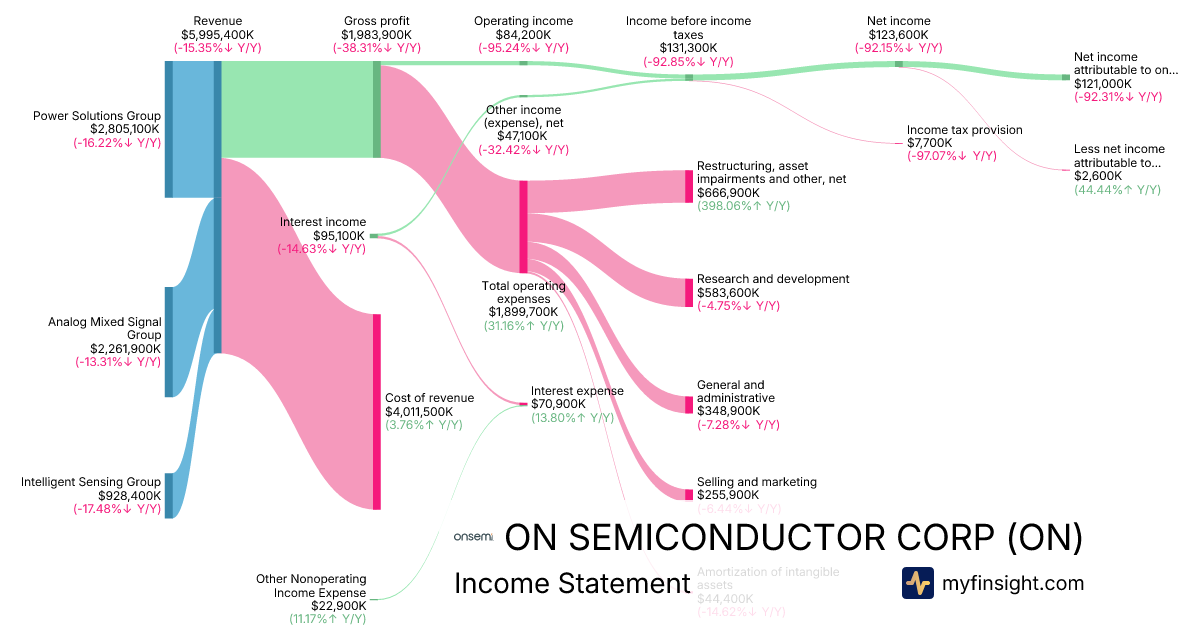 For the year ending 2025-12-31, ON made $5,995,400K in revenue. $121,000K in net income. Net profit margin of 2.02%.