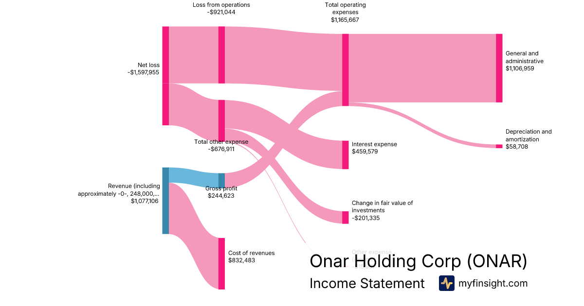 For the quarter ending 2025-09-30, ONAR made $1,077,106 in revenue. -$1,597,955 in net income. Net profit margin of -148.36%.