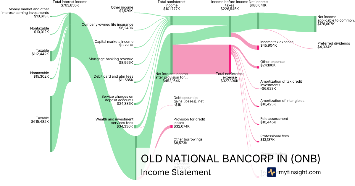 For the year ending 2025-12-31, ONB made $6,381,455K in revenue. $653,122K in net income. Net profit margin of 10.23%.