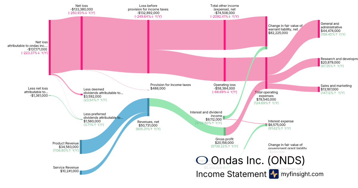 For the year ending 2025-12-31, ONDS made $50,731,000 in revenue. -$137,171,000 in net income. Net profit margin of -270.39%.
