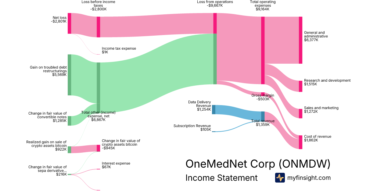 For the year ending 2025-12-31, ONMDW made $1,359K in revenue. -$2,801K in net income. Net profit margin of -206.11%.