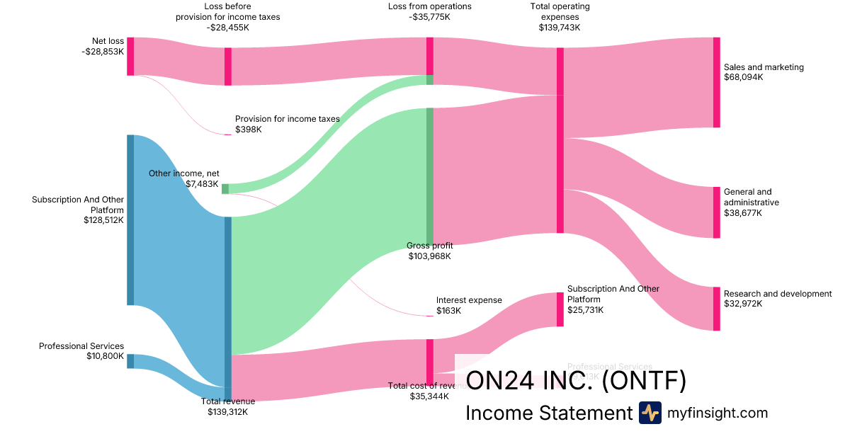 For the year ending 2025-12-31, ONTF made $139,312K in revenue. -$28,853K in net income. Net profit margin of -20.71%.