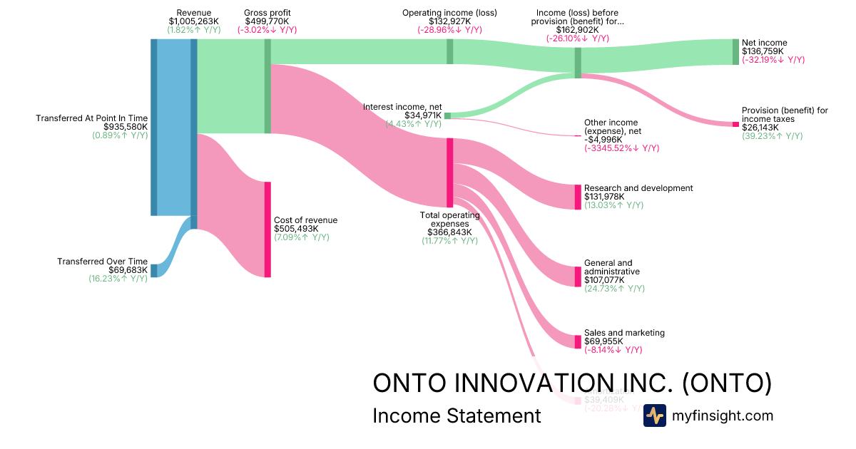 For the year ending 2026-01-03, ONTO made $1,005,263K in revenue. $136,759K in net income. Net profit margin of 13.60%.