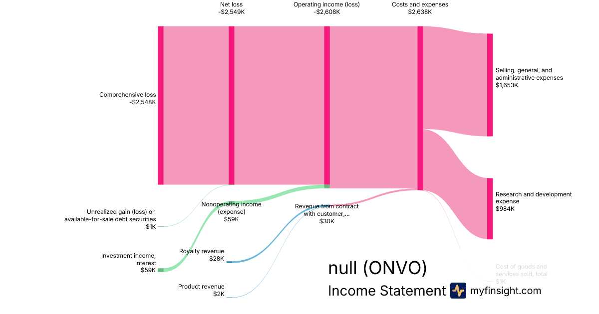 For the quarter ending 2024-09-30, ONVO made $30K in revenue. -$2,548K in net income. Net profit margin of -8493.33%.