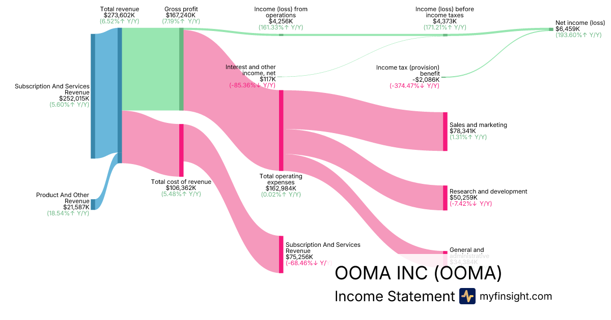 For the year ending 2026-01-31, OOMA made $273,602K in revenue. $6,459K in net income. Net profit margin of 2.36%.
