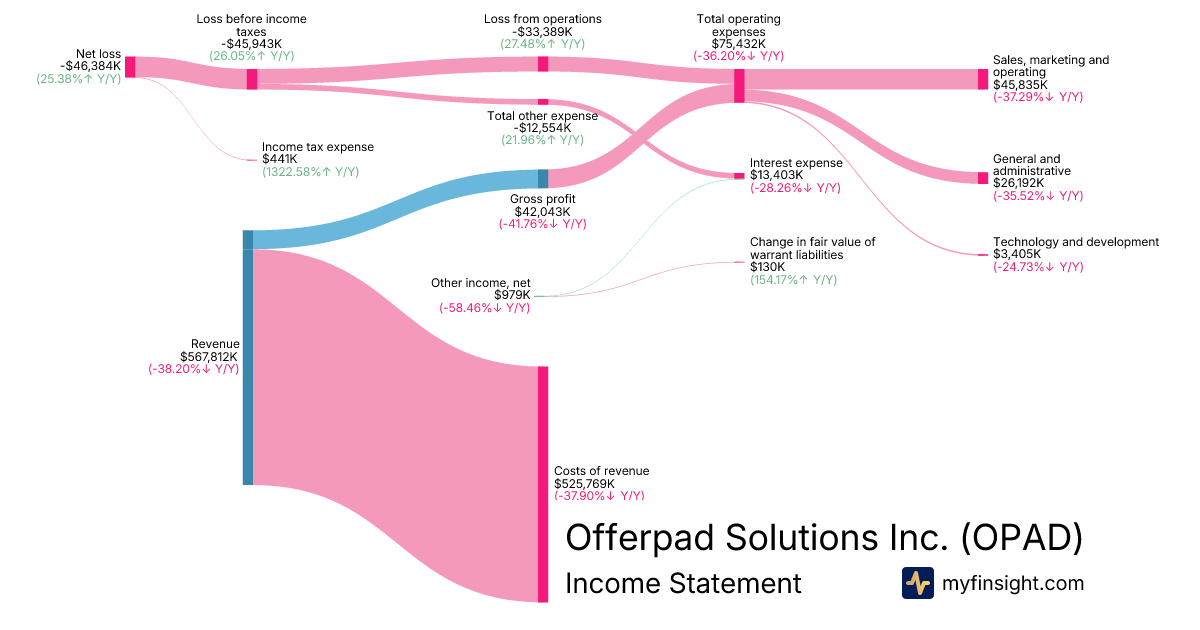 For the year ending 2025-12-31, OPAD made $567,812K in revenue. -$46,384K in net income. Net profit margin of -8.17%.