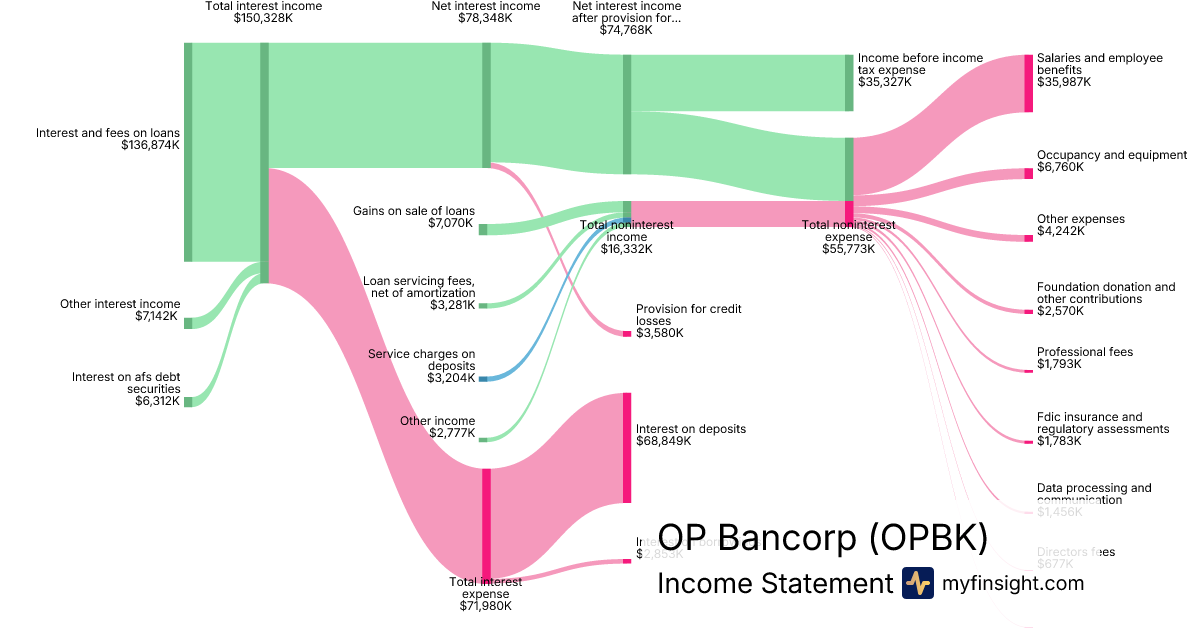 For the year ending 2025-12-31, OPBK made $3,204K in revenue. $35,327K in net income. Net profit margin of 1102.59%.