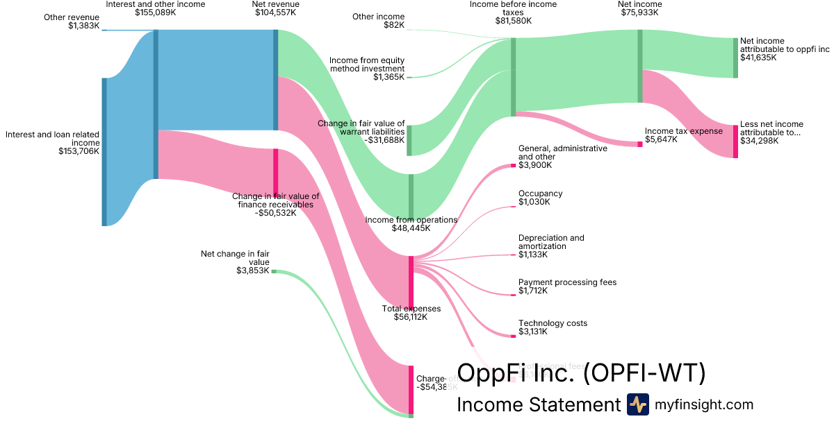 For the quarter ending 2025-09-30, OPFI-WT made $104,557K in revenue. $41,635K in net income. Net profit margin of 39.82%.