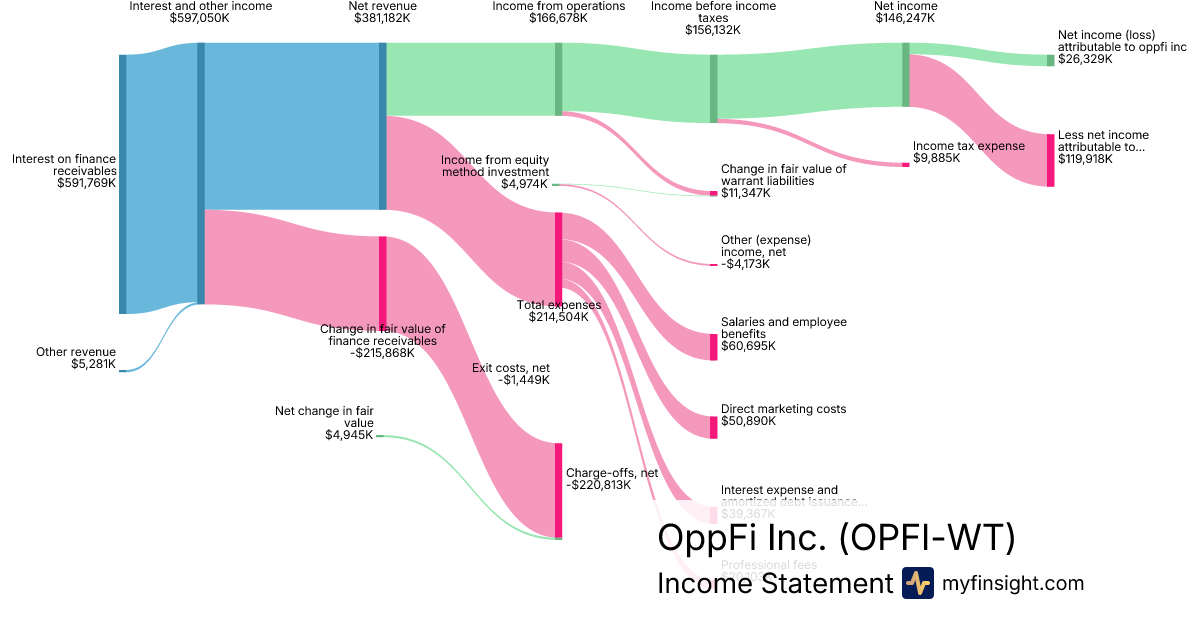 For the year ending 2025-12-31, OPFI-WT made $381,182K in revenue. $26,329K in net income. Net profit margin of 6.91%.