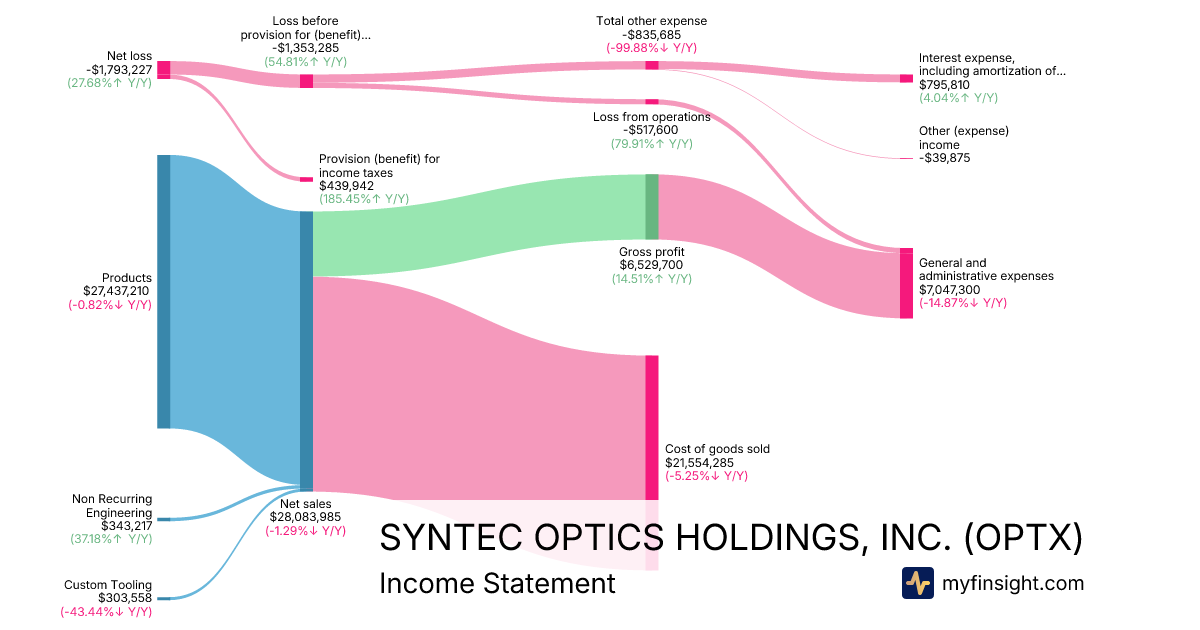 For the year ending 2025-12-31, OPTX made $28,083,985 in revenue. -$1,793,227 in net income. Net profit margin of -6.39%.