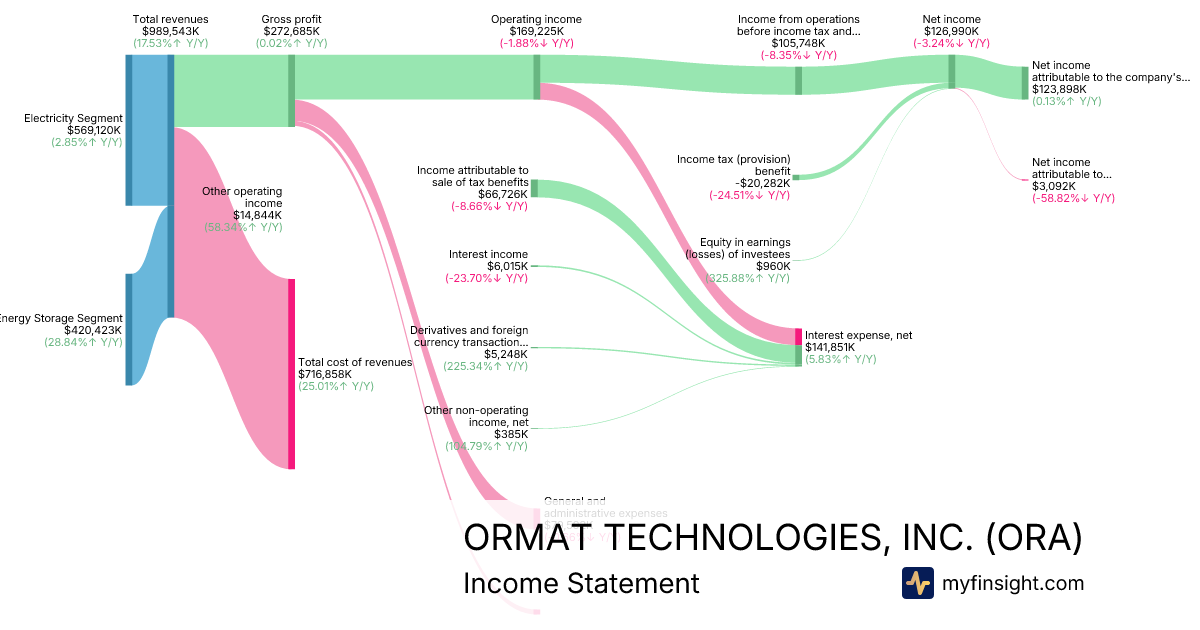For the year ending 2025-12-31, ORA made $989,543K in revenue. $123,898K in net income. Net profit margin of 12.52%.