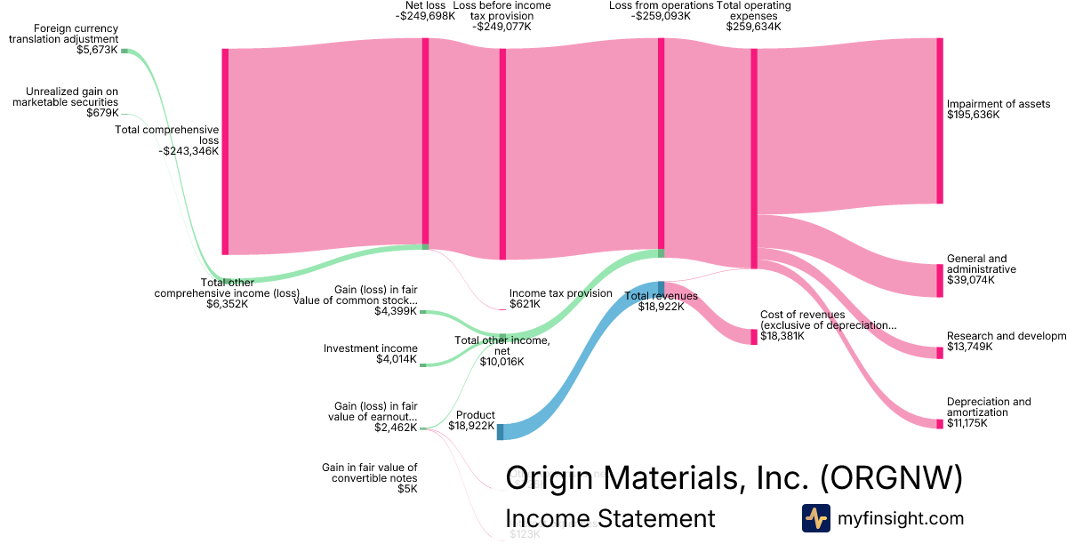 For the year ending 2025-12-31, ORGNW made $18,922K in revenue. -$243,346K in net income. Net profit margin of -1286.05%.