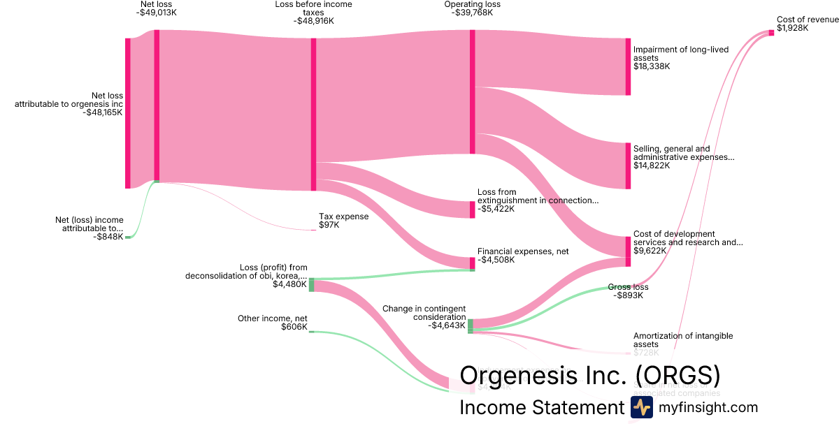 For the year ending 2024-12-31, ORGS made $1,035K in revenue. -$48,165K in net income. Net profit margin of -4653.62%.
