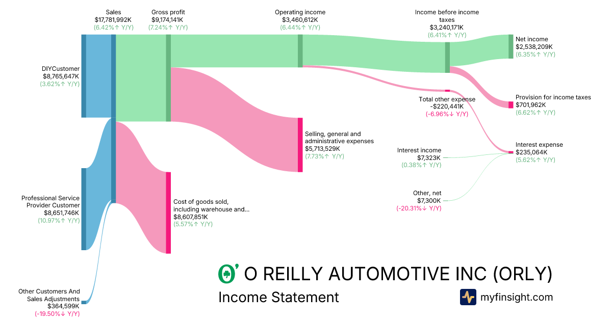 For the year ending 2025-12-31, ORLY made $17,781,992K in revenue. $2,538,209K in net income. Net profit margin of 14.27%.