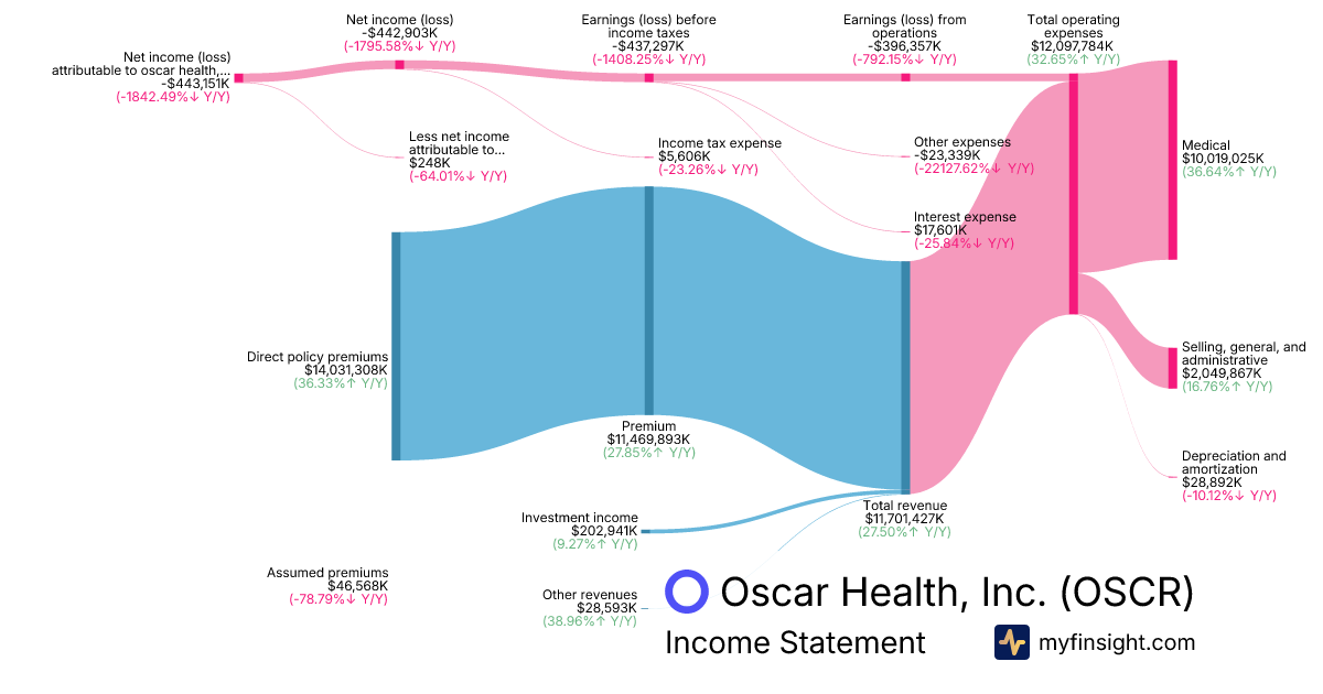 For the year ending 2025-12-31, OSCR made $11,701,427K in revenue. -$443,151K in net income. Net profit margin of -3.79%.