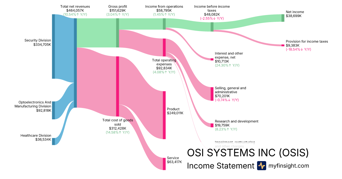 For the quarter ending 2025-12-31, OSIS made $464,057K in revenue. $38,699K in net income. Net profit margin of 8.34%.