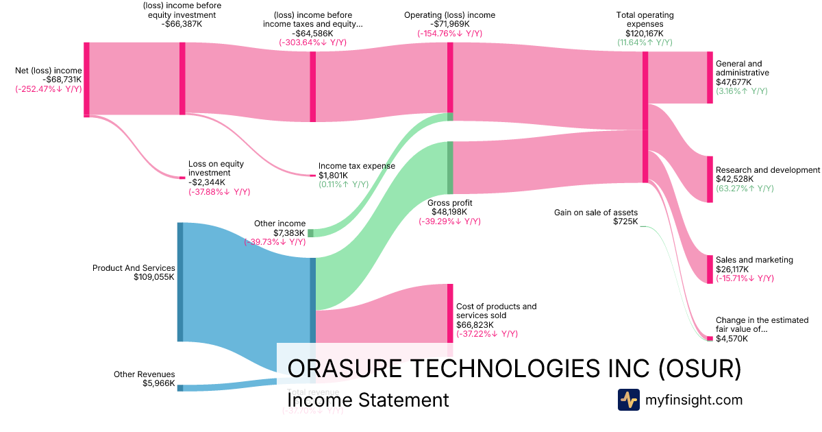For the year ending 2025-12-31, OSUR made $115,021K in revenue. -$68,731K in net income. Net profit margin of -59.76%.