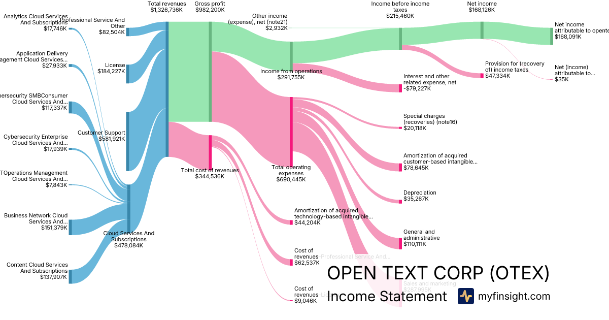For the quarter ending 2025-12-31, OTEX made $1,326,736K in revenue. $168,091K in net income. Net profit margin of 12.67%.