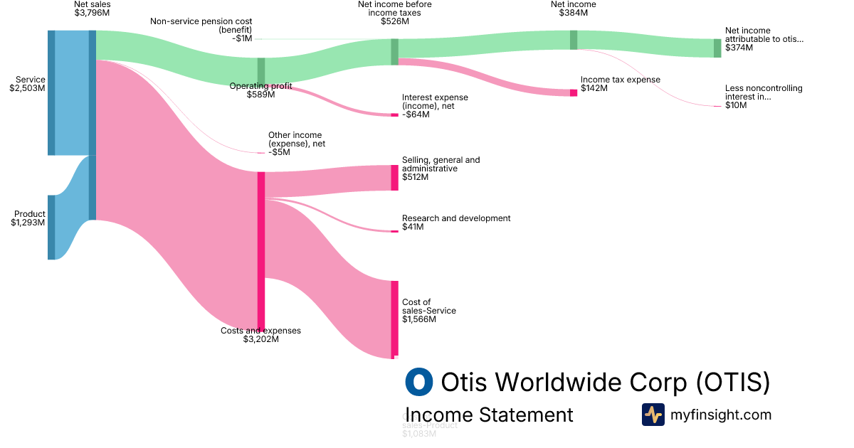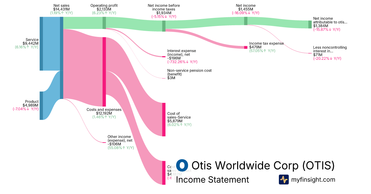 For the year ending 2025-12-31, OTIS made $14,431M in revenue. $1,384M in net income. Net profit margin of 9.59%.
