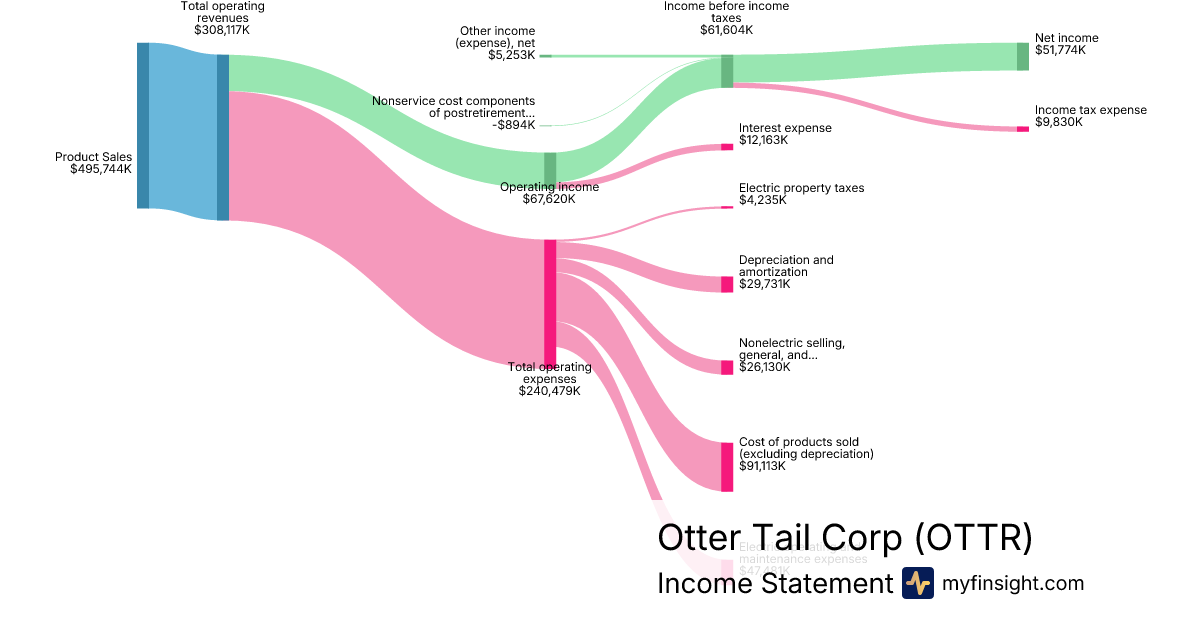 For the year ending 2025-12-31, OTTR made $1,304,058K in revenue. $275,893K in net income. Net profit margin of 21.16%.