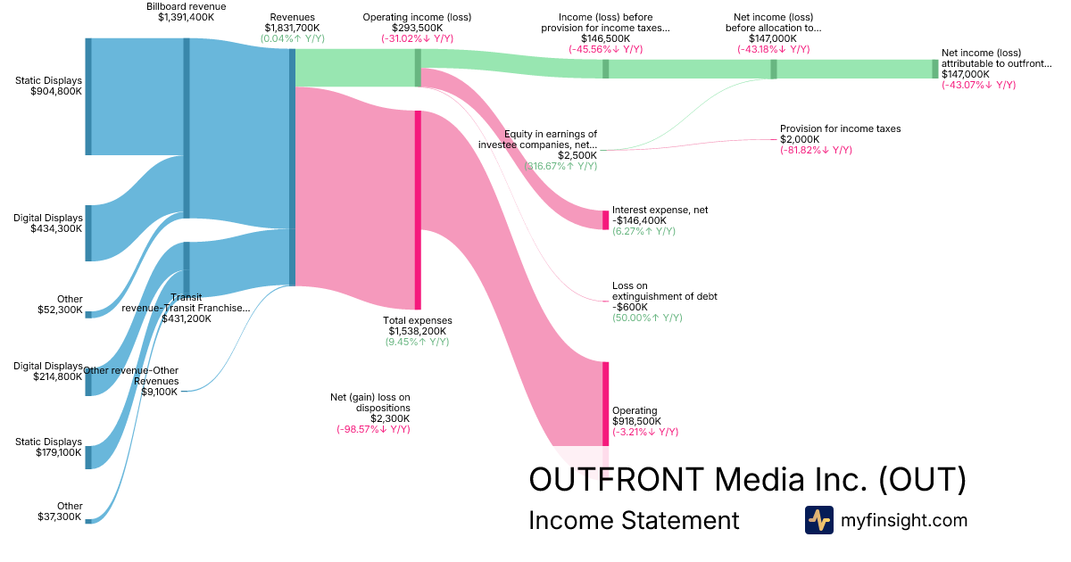 For the year ending 2025-12-31, OUT made $1,831,700K in revenue. $147,000K in net income. Net profit margin of 8.03%.