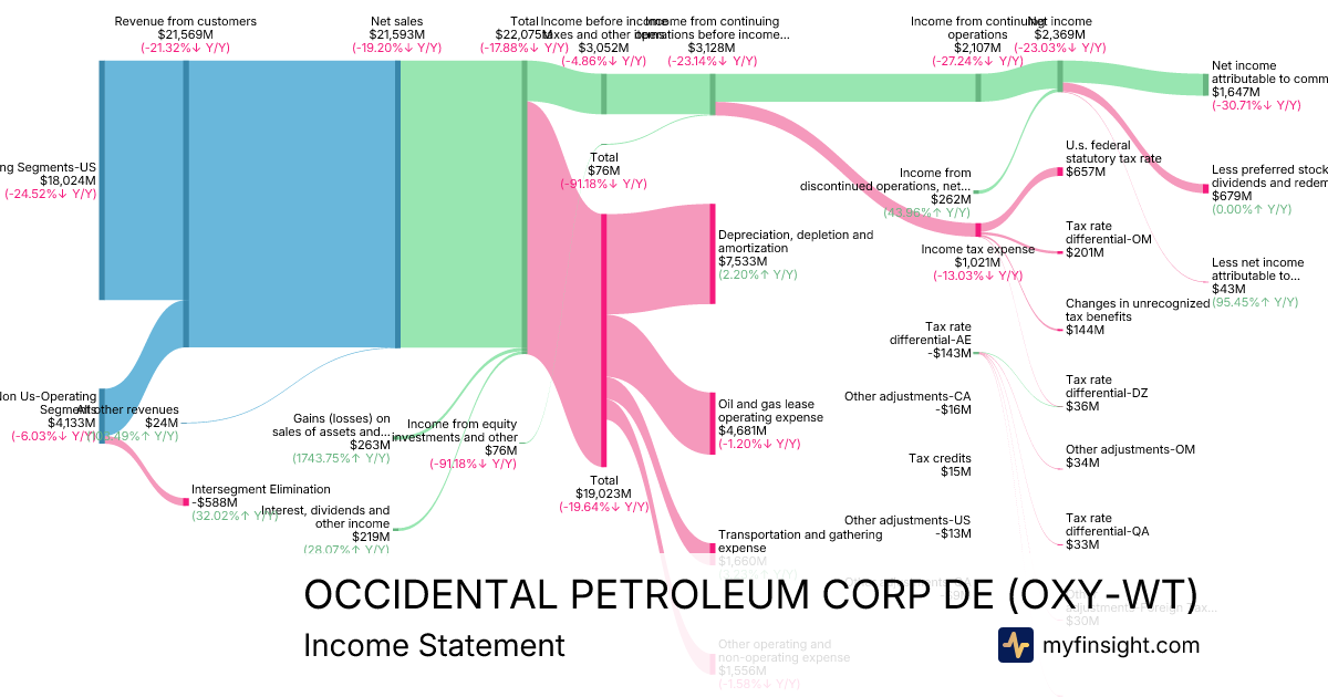 For the year ending 2025-12-31, OXY-WT made $21,593M in revenue. $1,647M in net income. Net profit margin of 7.63%.