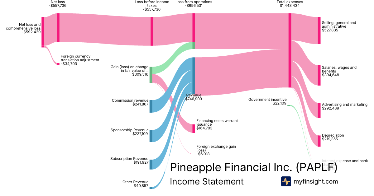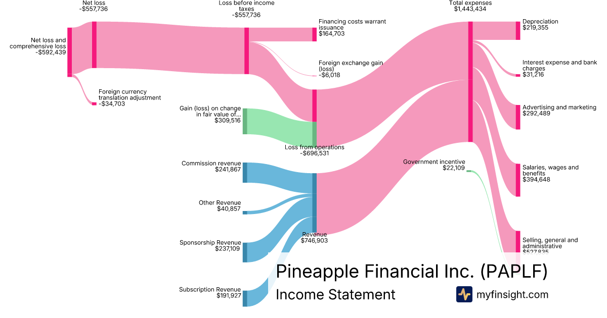 For the quarter ending 2025-05-31, PAPLF made $746,903 in revenue. -$592,439 in net income. Net profit margin of -79.32%.