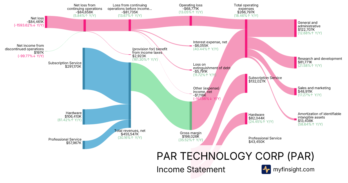 For the year ending 2025-12-31, PAR made $455,547K in revenue. -$84,461K in net income. Net profit margin of -18.54%.