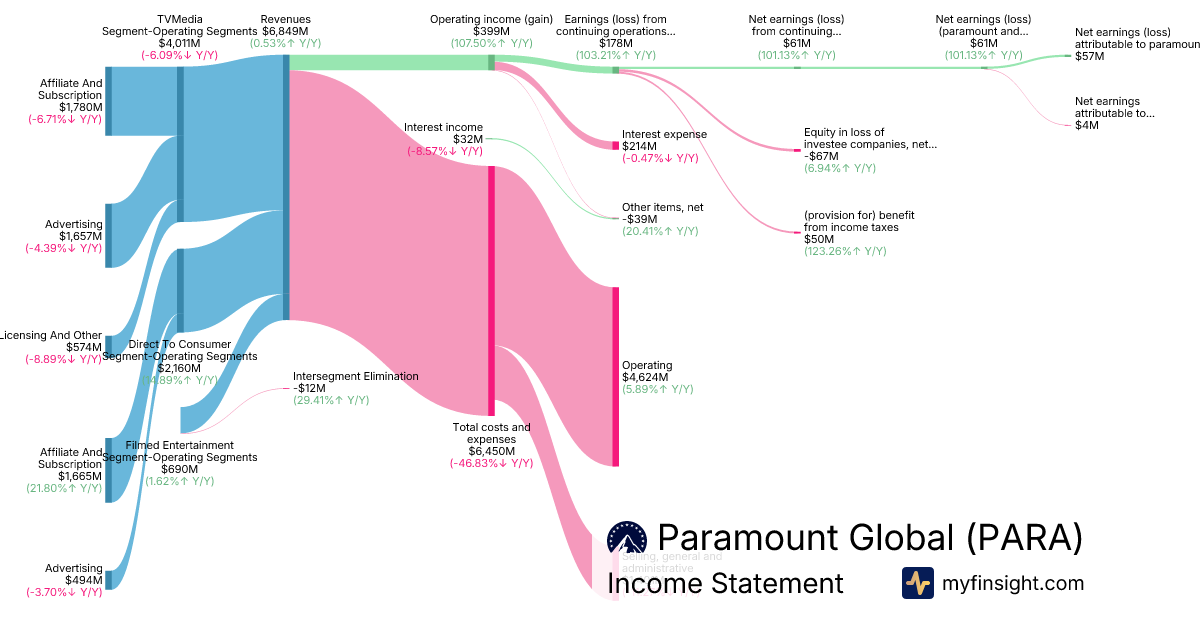 For the quarter ending 2025-06-30, PARA made $6,849M in revenue. $57M in net income. Net profit margin of 0.83%.