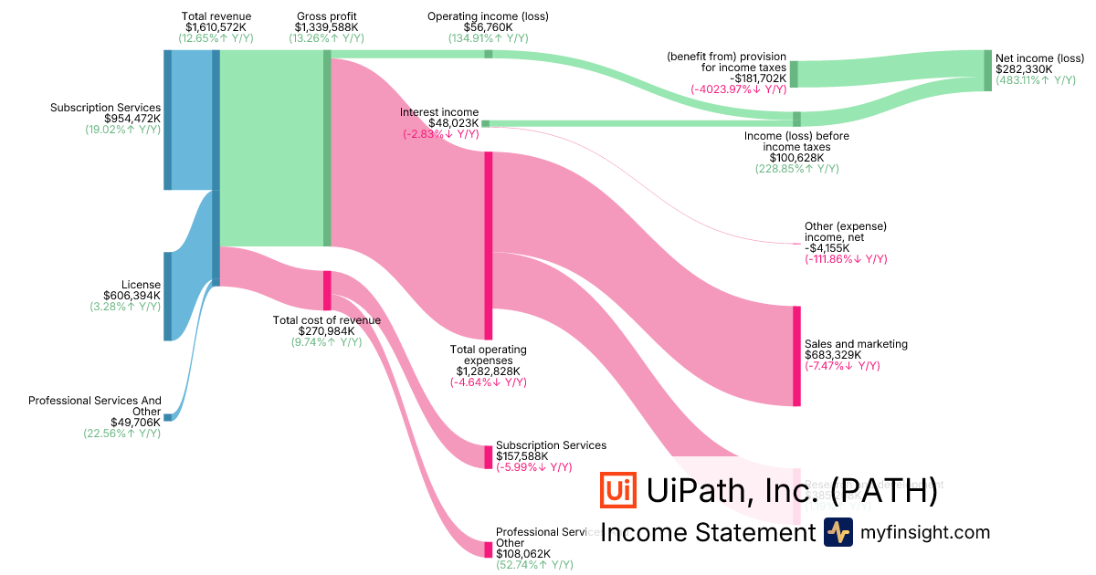 For the year ending 2026-01-31, PATH made $1,610,572K in revenue. $282,330K in net income. Net profit margin of 17.53%.