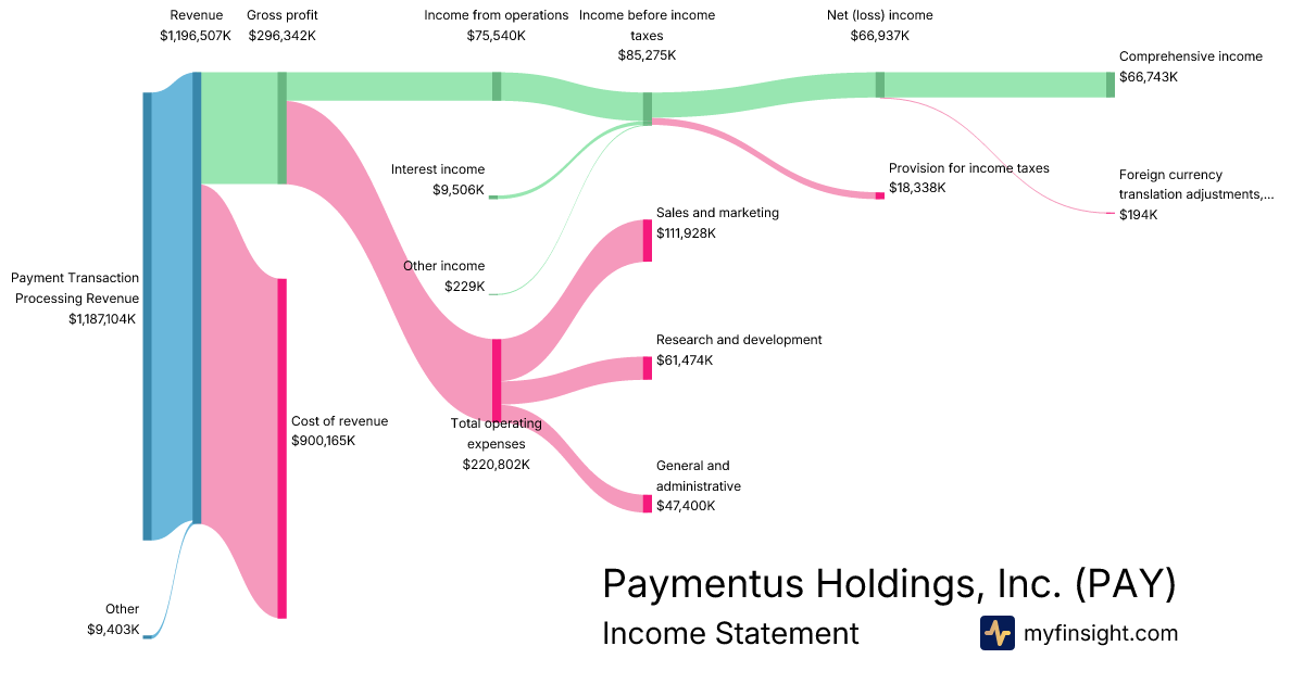 For the year ending 2025-12-31, PAY made $1,196,507K in revenue. $66,743K in net income. Net profit margin of 5.58%.