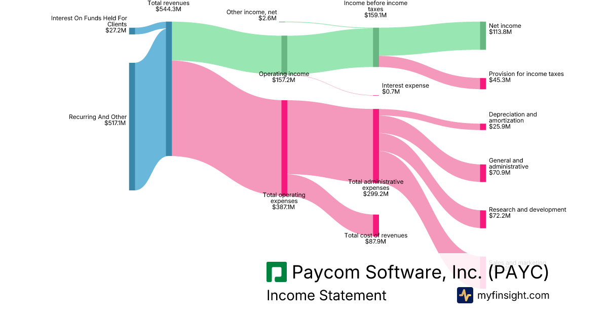 For the year ending 2025-12-31, PAYC made $2,051,700K in revenue. $453,400K in net income. Net profit margin of 22.10%.