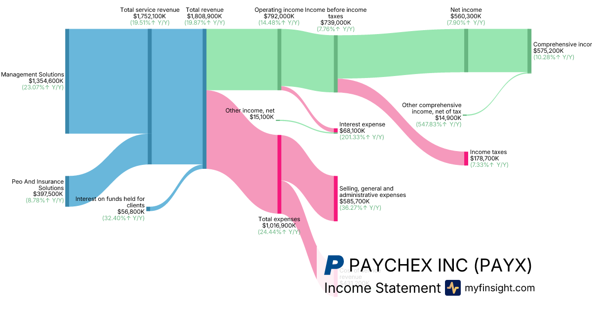 For the quarter ending 2026-02-28, PAYX made $1,808,900K in revenue. $575,200K in net income. Net profit margin of 31.80%.