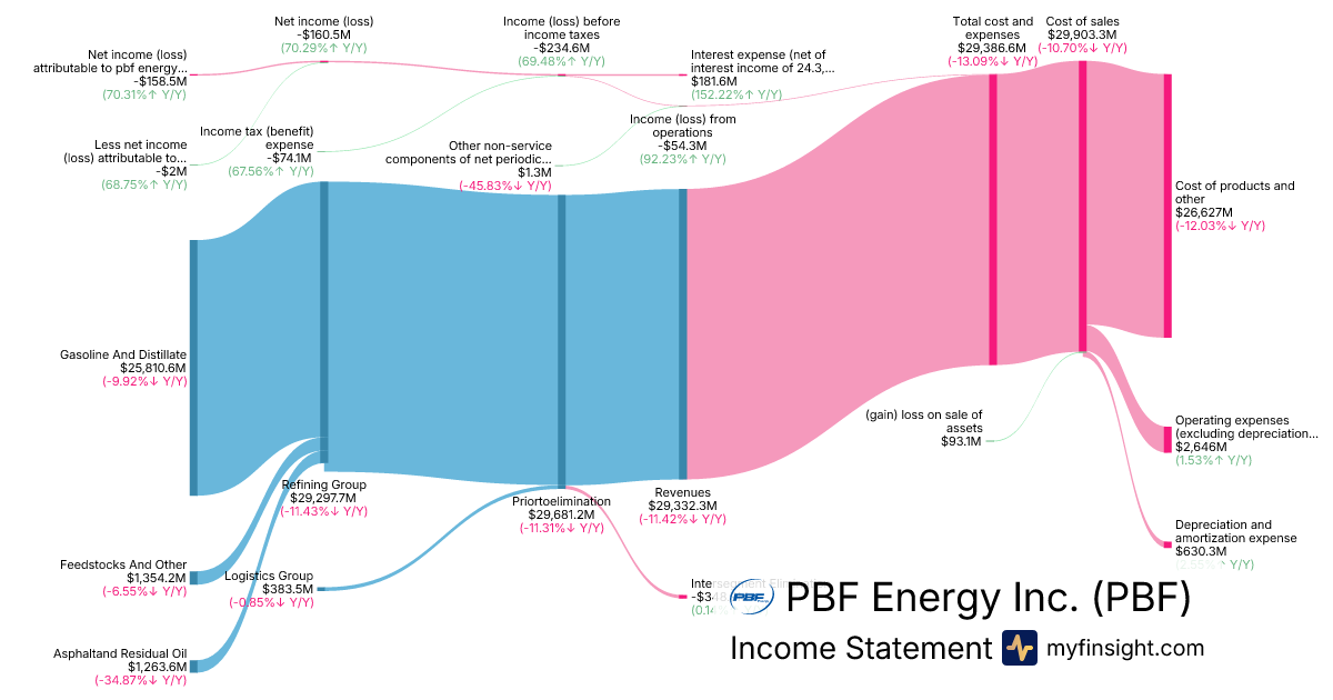 For the year ending 2025-12-31, PBF made $29,332.3M in revenue. -$158.5M in net income. Net profit margin of -0.54%.