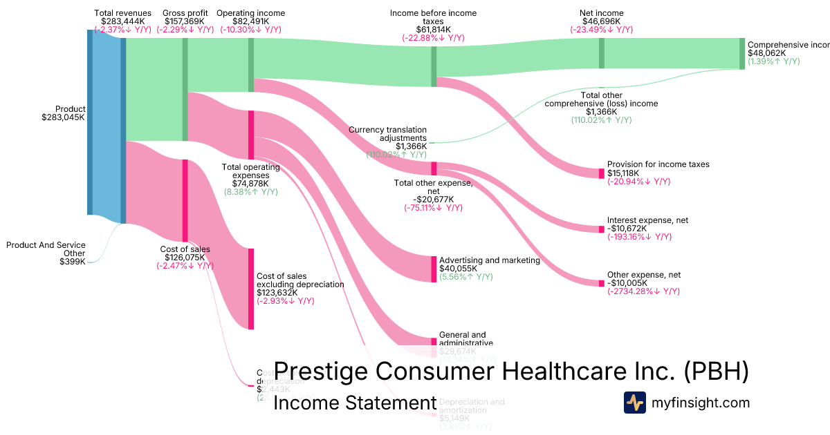 For the quarter ending 2025-12-31, PBH made $283,444K in revenue. $48,062K in net income. Net profit margin of 16.96%.