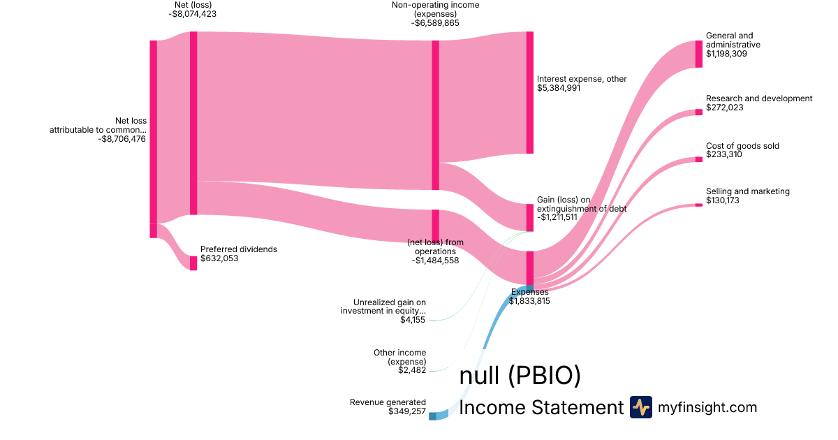For the quarter ending 2024-03-31, PBIO made $349,257 in revenue. -$8,706,476 in net income. Net profit margin of -2492.86%.
