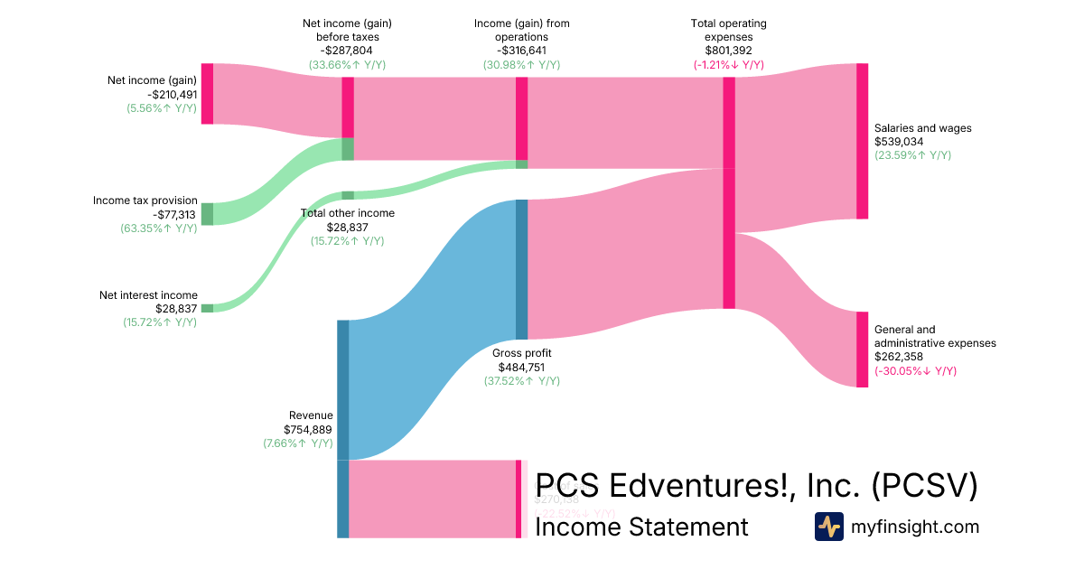For the quarter ending 2025-12-31, PCSV made $754,889 in revenue. -$210,491 in net income. Net profit margin of -27.88%.
