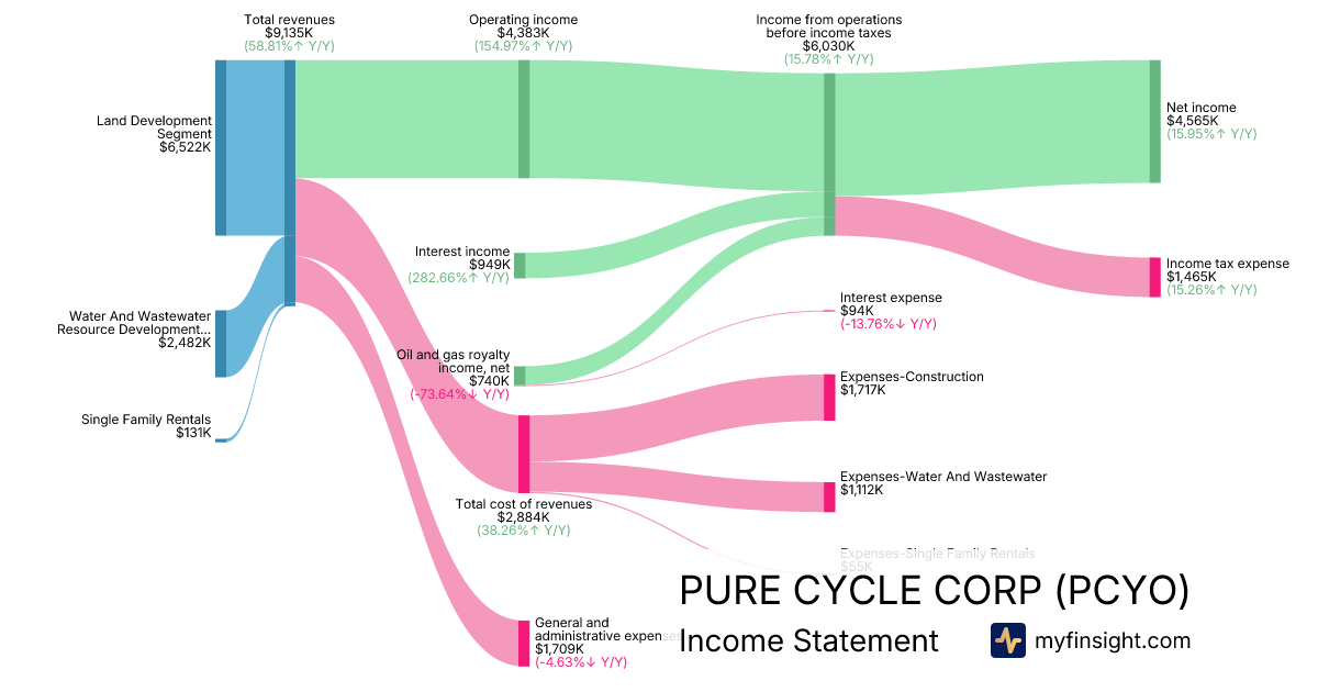 For the quarter ending 2025-11-30, PCYO made $9,135K in revenue. $4,565K in net income. Net profit margin of 49.97%.