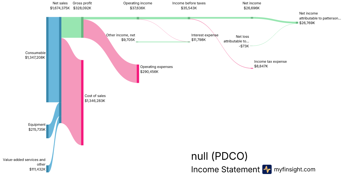 For the quarter ending 2024-10-26, PDCO made $1,674,375K in revenue. $26,769K in net income. Net profit margin of 1.60%.