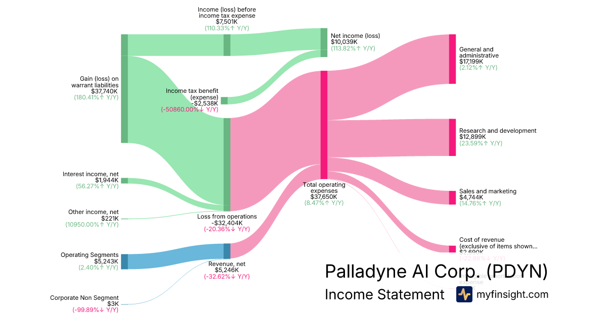 For the year ending 2025-12-31, PDYN made $5,246K in revenue. $10,039K in net income. Net profit margin of 191.36%.