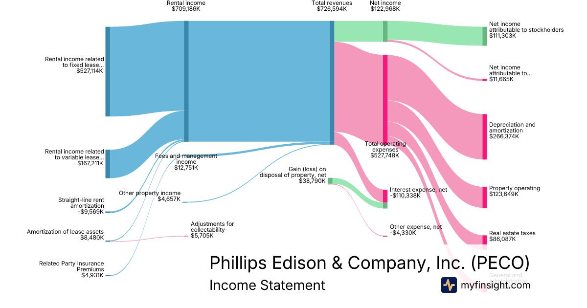 For the year ending 2025-12-31, PECO made $726,594K in revenue. $111,303K in net income. Net profit margin of 15.32%.