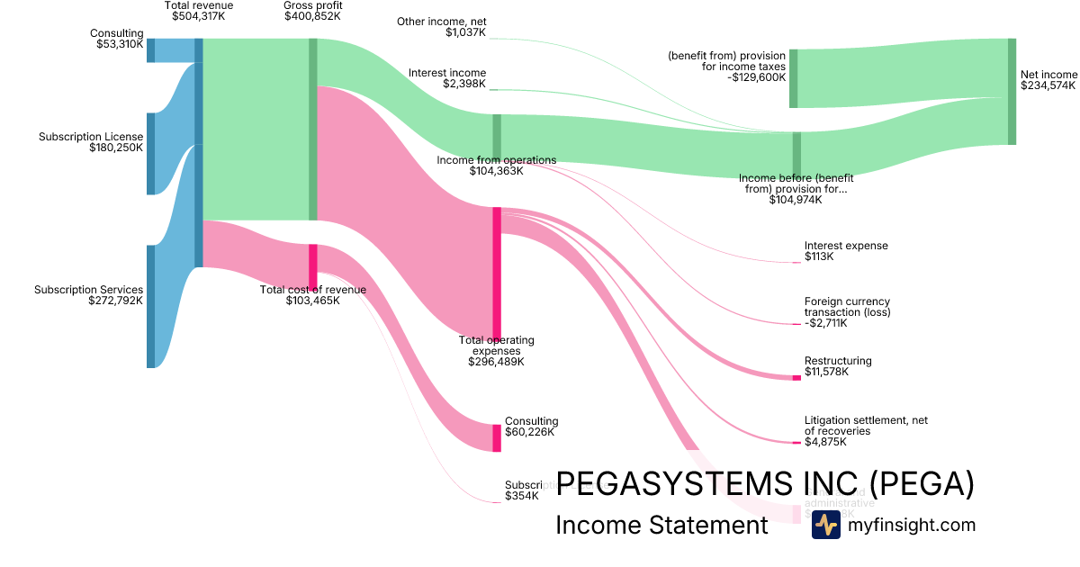 For the year ending 2025-12-31, PEGA made $1,745,812K in revenue. $393,437K in net income. Net profit margin of 22.54%.