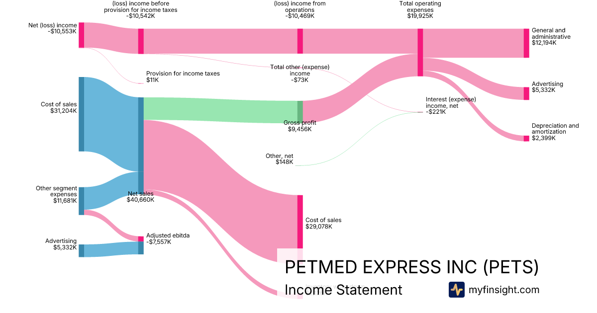 For the quarter ending 2025-12-31, PETS made $40,660K in revenue. -$10,553K in net income. Net profit margin of -25.95%.