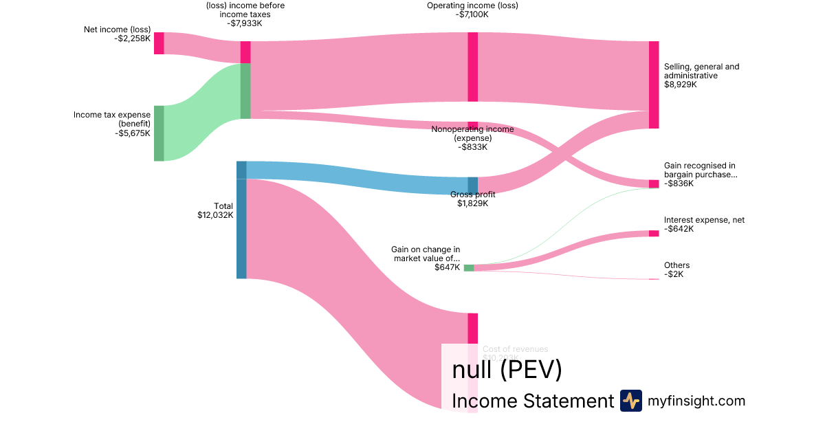 For the quarter ending 2024-06-30, PEV made $12,032K in revenue. -$2,258K in net income. Net profit margin of -18.77%.