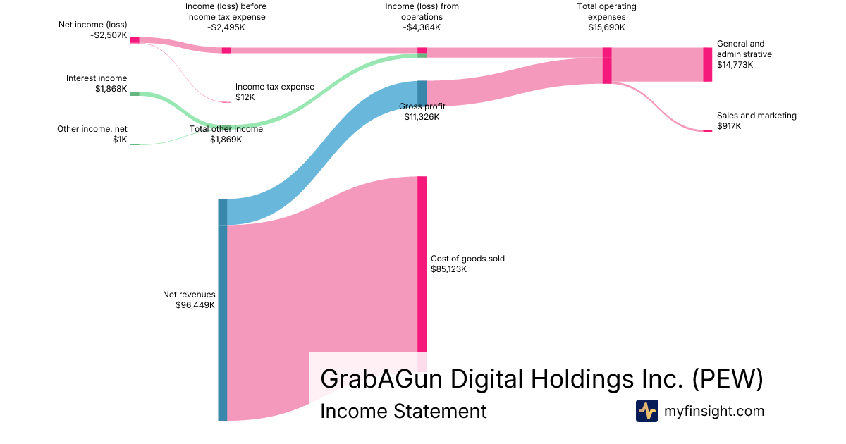 For the year ending 2025-12-31, PEW made $96,449K in revenue. -$2,507K in net income. Net profit margin of -2.60%.