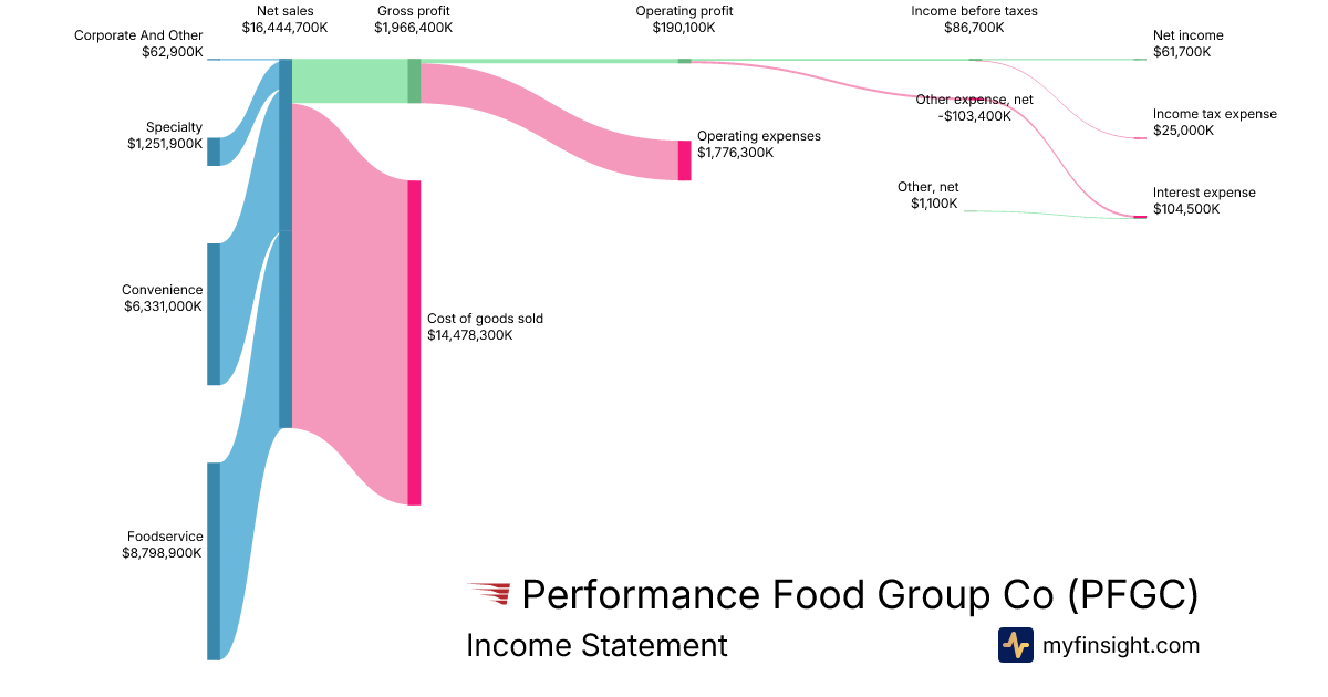 For the quarter ending 2025-12-27, PFGC made $16,444,700K in revenue. $61,700K in net income. Net profit margin of 0.38%.