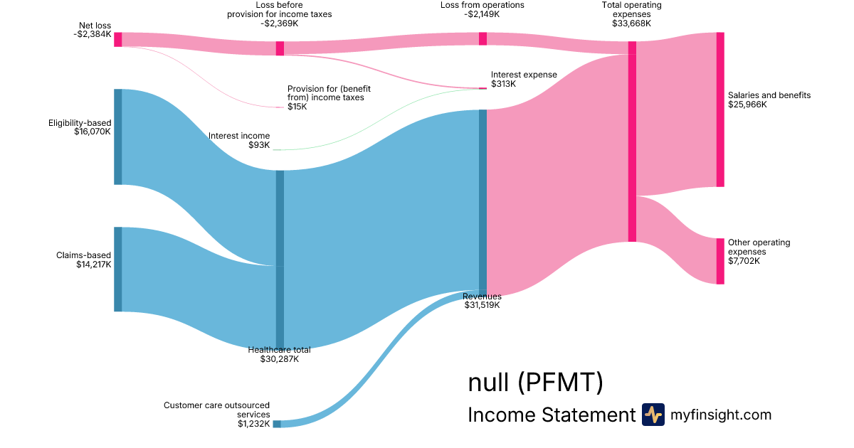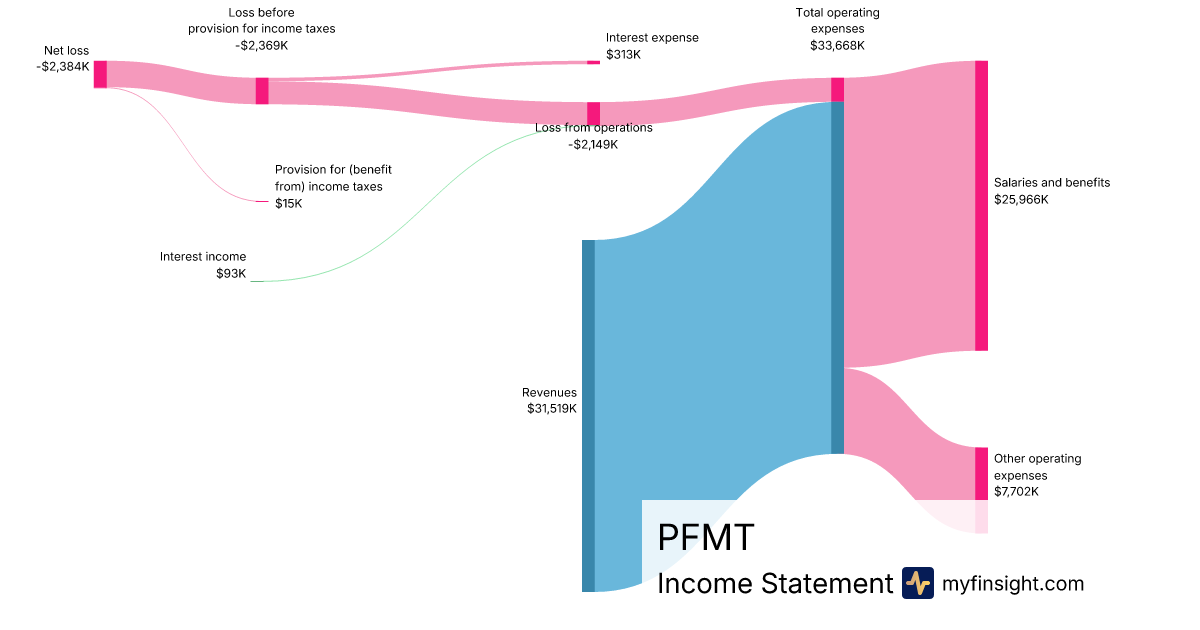 For the quarter ending 2024-09-30, PFMT made $31,519K in revenue. -$2,384K in net income. Net profit margin of -7.56%.