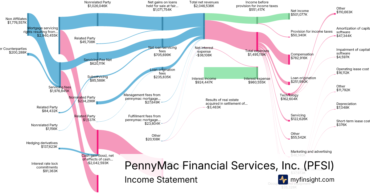 For the year ending 2025-12-31, PFSI made $2,046,536K in revenue. $501,077K in net income. Net profit margin of 24.48%.